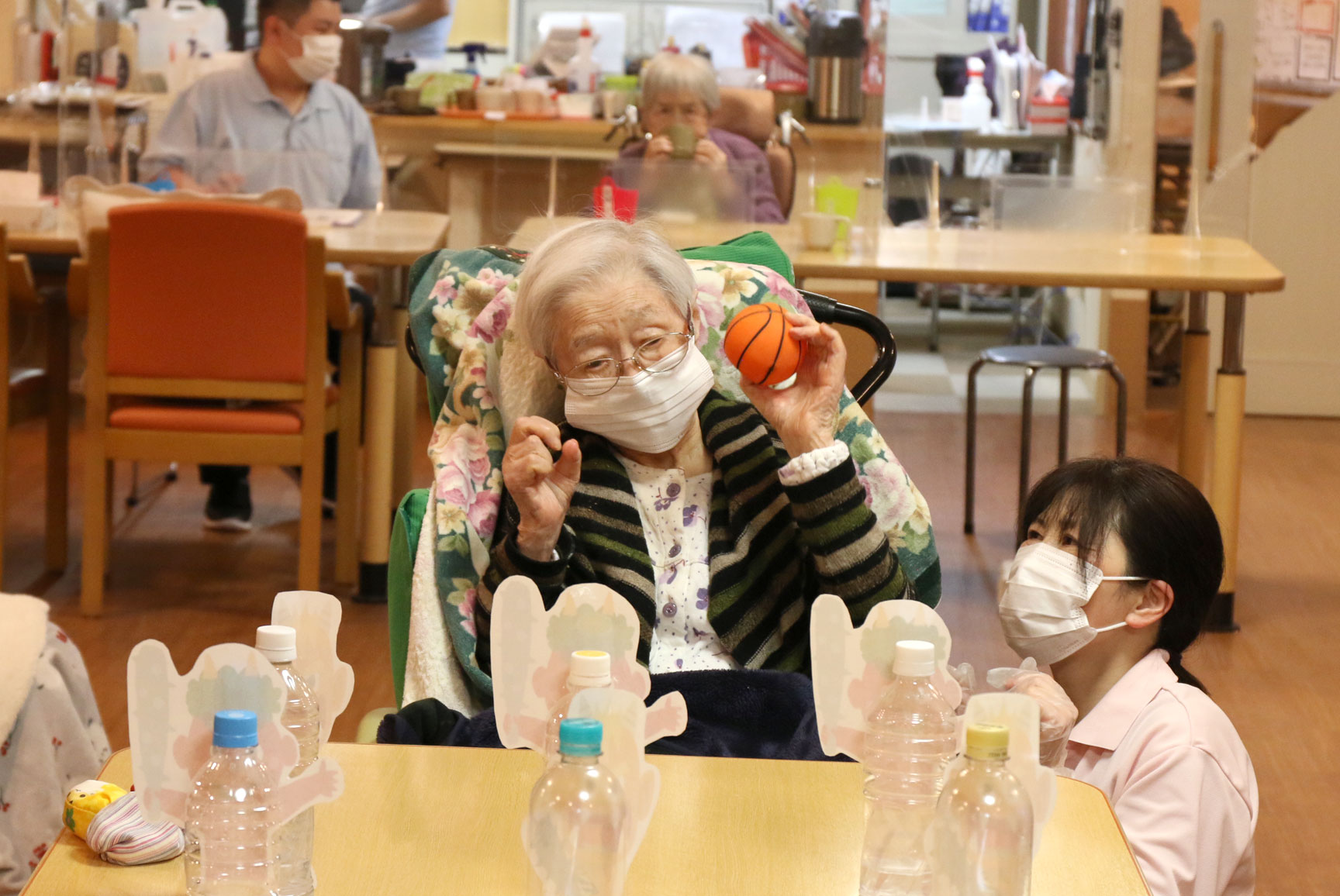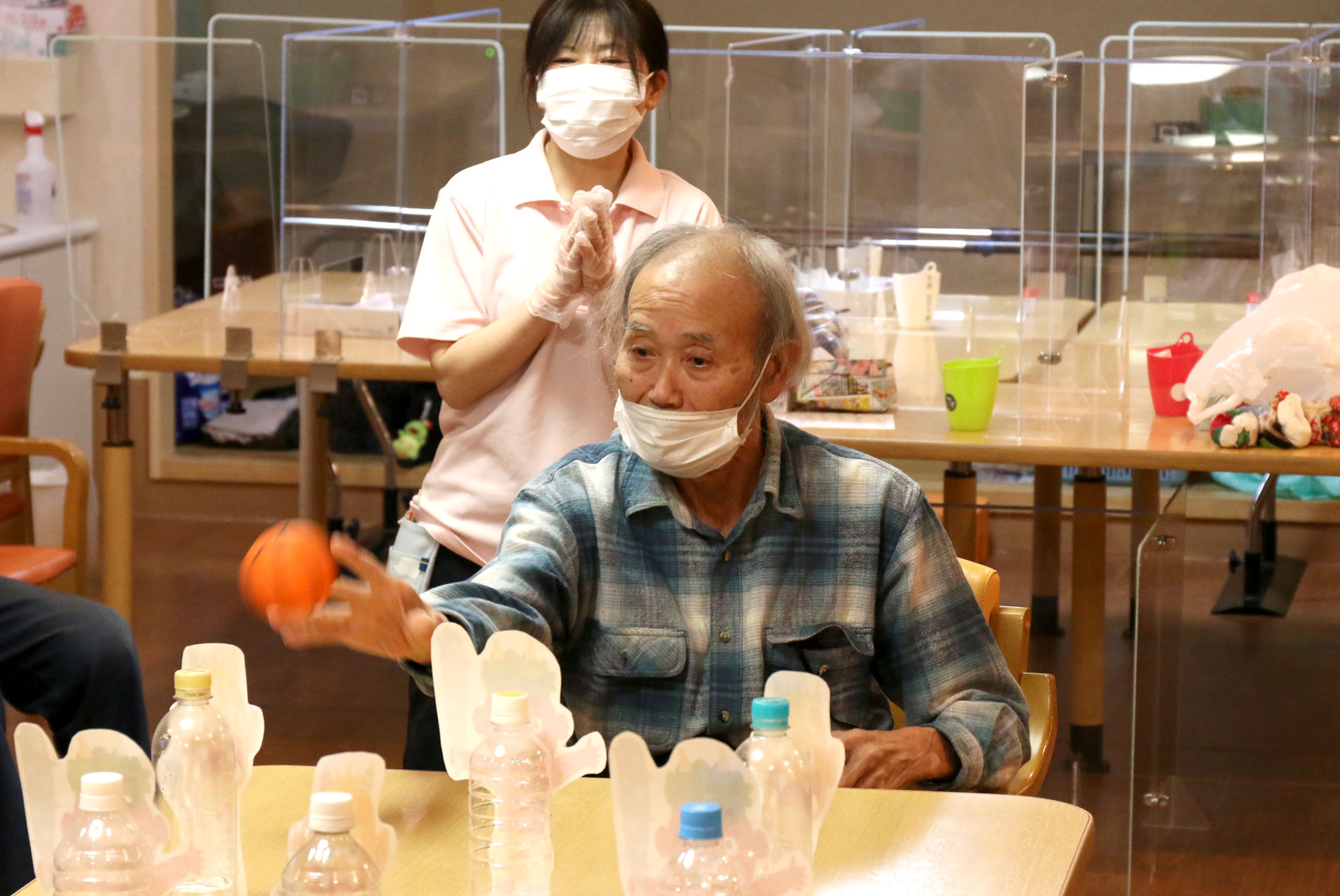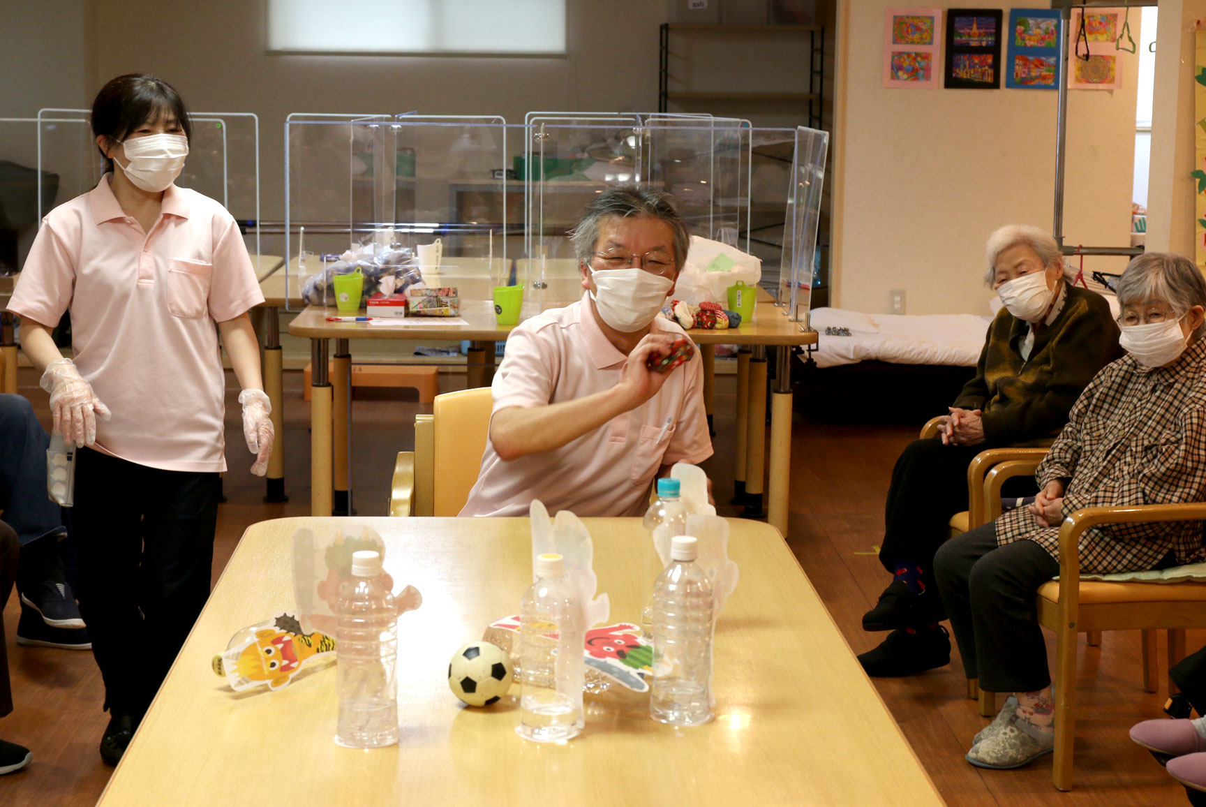 ご利用者様には新聞紙で丸めた「豆」を鬼に向かって投げてもらいました
