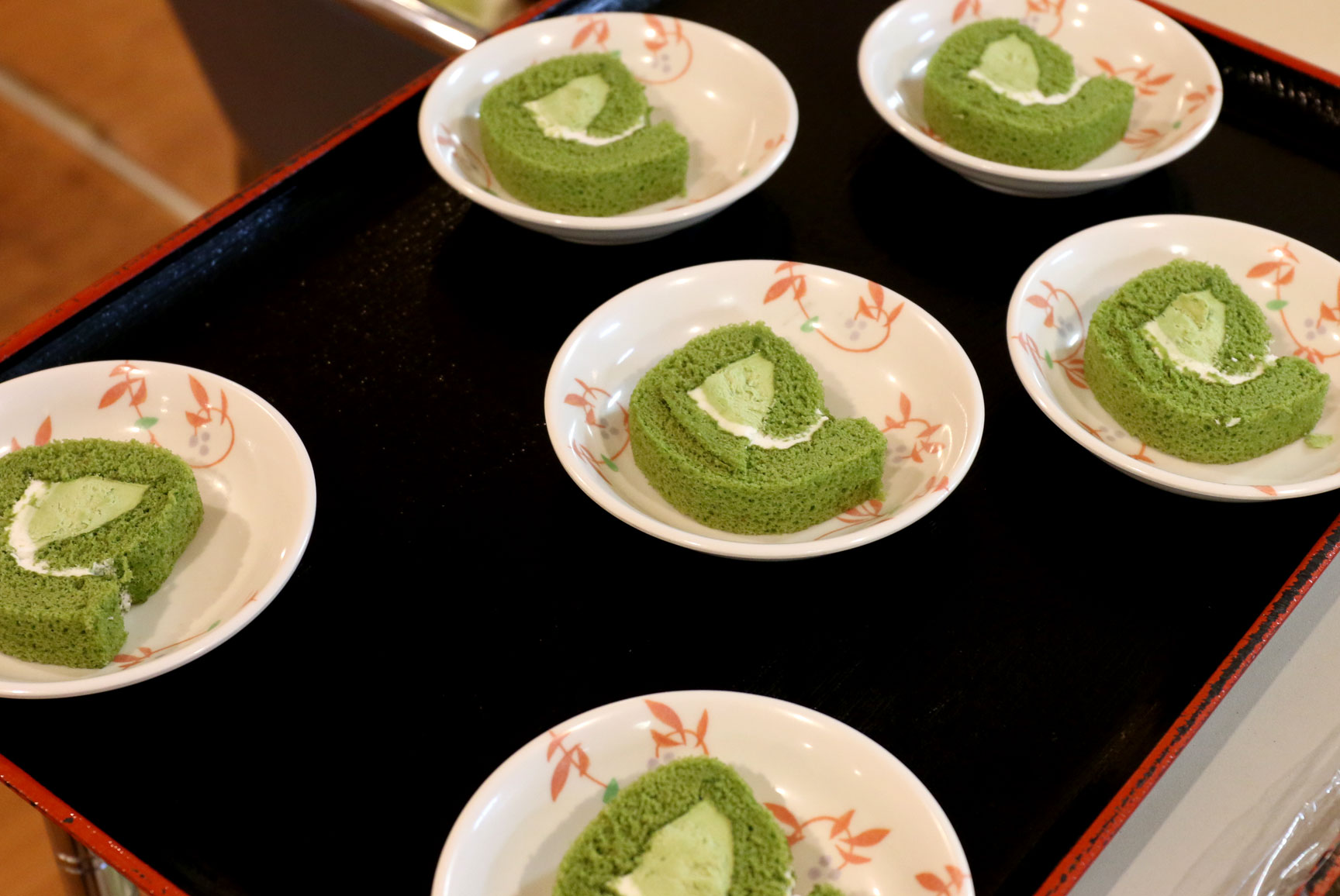 お茶とおやつの時間には、節分に食べる恵方巻きにちなんでかな? 抹茶のロールケーキが提供されました