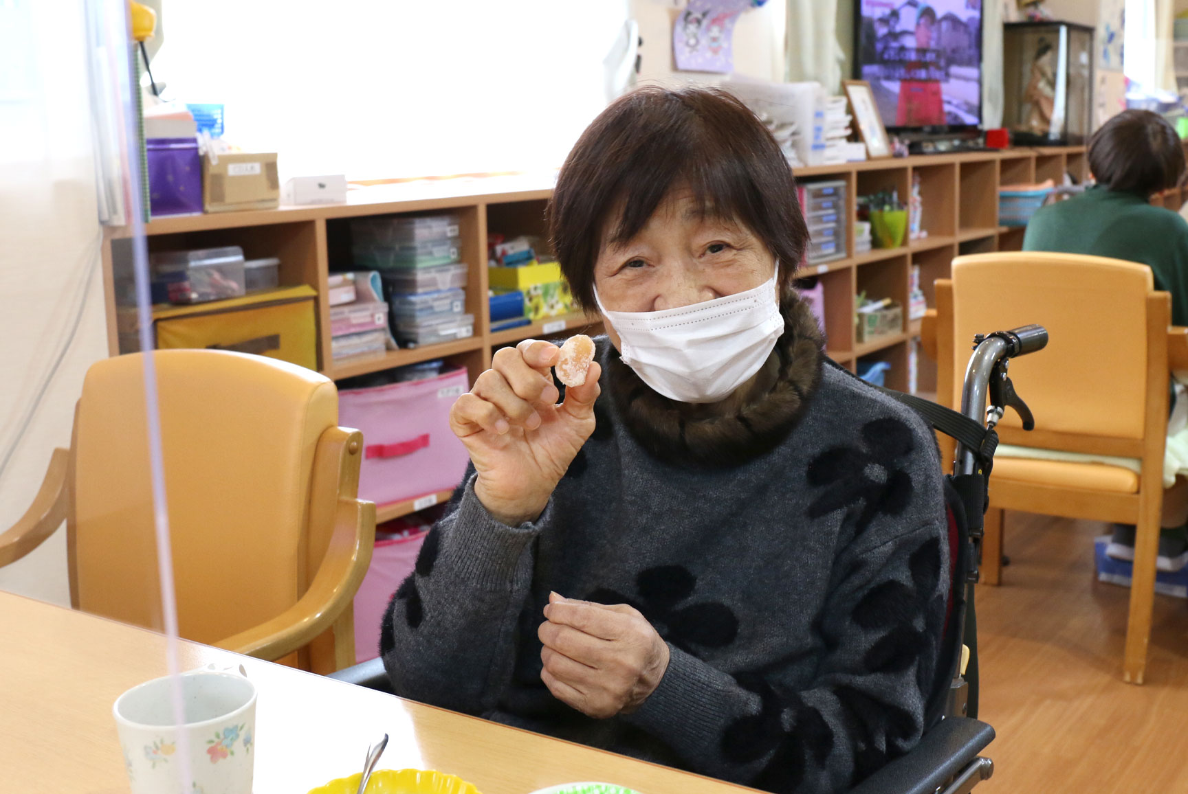 おやつは抹茶ババロアと、節分にちなんで「甘納豆」