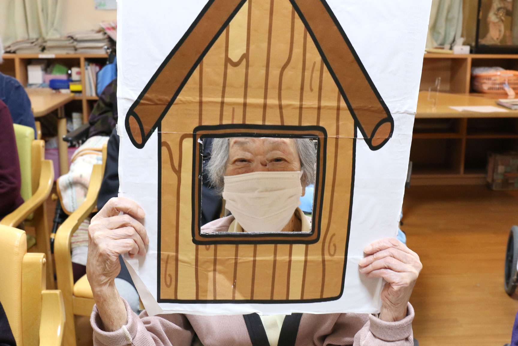 O様は木の家から顔を出しました